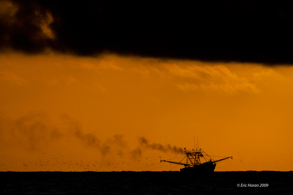 Everything about my venture onto Hunting Island appeared dark and ominous on this morning. I walked under a black-cloud ceiling with wet sand under foot and following a heavy rainfall. From the beach-front, I watched this lone shrimp boat defy the threatening skies with nets dragging while running at full steam. I had to work quickly to take advantage of this silhouette image of the working ship. The autumn colored strip of clear sky above the horizon was a nice backdrop while the black cloud cover filling the remainder of the sky added tension and a nice frame.The weather forecast called for the clearing skies and by 9:00 am, not a cloud remained. I left the park as this early morning drama vanished into blue sky. I gave a cheer for the shrimpers working the ocean waters that morning, wishing them and all local fisherman much success in an increasingly difficult marketplace.