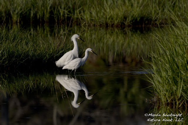Curious Duo - I noticed these two snowy egrets walk away from the crowd and focus on something in the water. I followed them with my camera and saw that they were looking at a disturbance in the water and it piqued their interest, as well as mine, but they became very still, allowing for an interesting composition with a mirror-like reflection.
